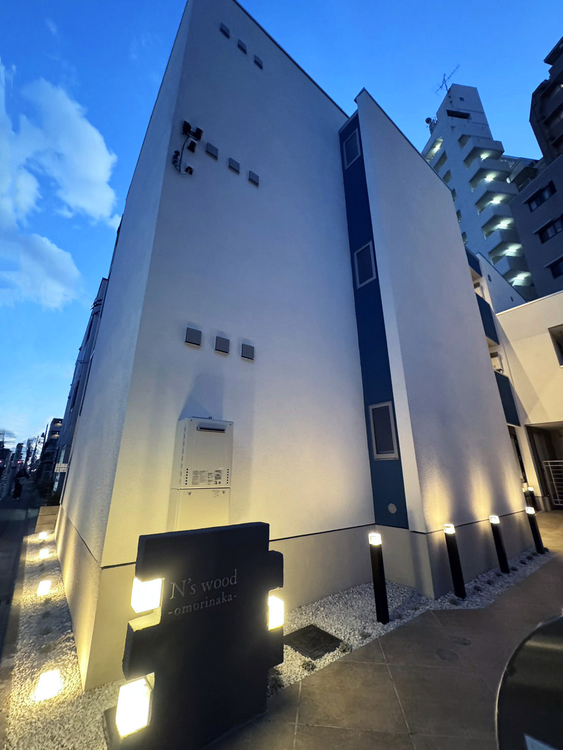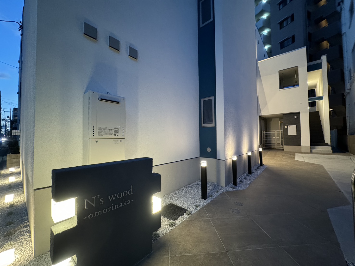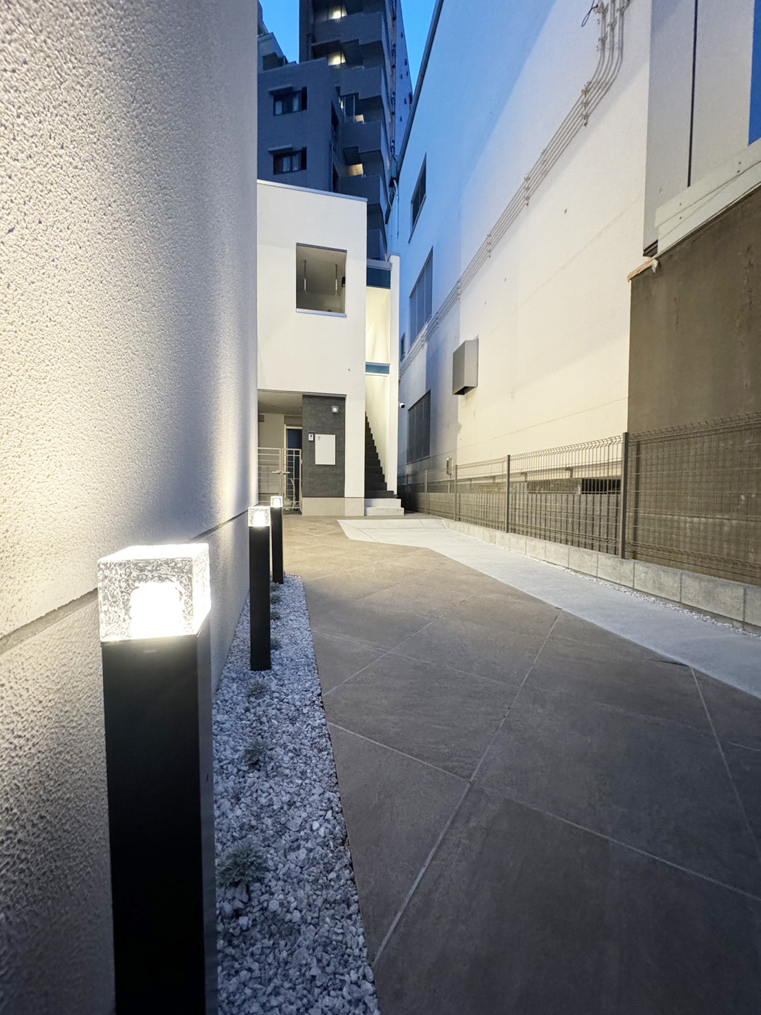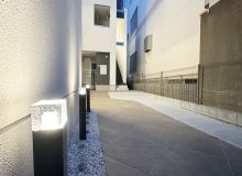 アプローチは、建物の奥まった位置にエントランスがあることから、明るさと視認性を重視して計画しました。スタンドライトを複数配置することで、夜間でも十分な明るさを確保。また、人が隠れやすい死角をつくらないよう、見通しの良さにも配慮し、防犯性を高めています。 ガラスブロックの照明を採用することで、点灯時には柔らかな光がアプローチ全体を照らしだすよう演出しました。 機能性と意匠性を両立させた、印象的なエントランスアプローチです。