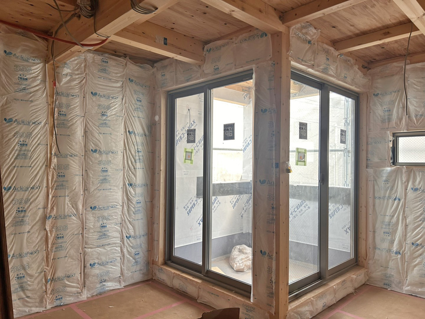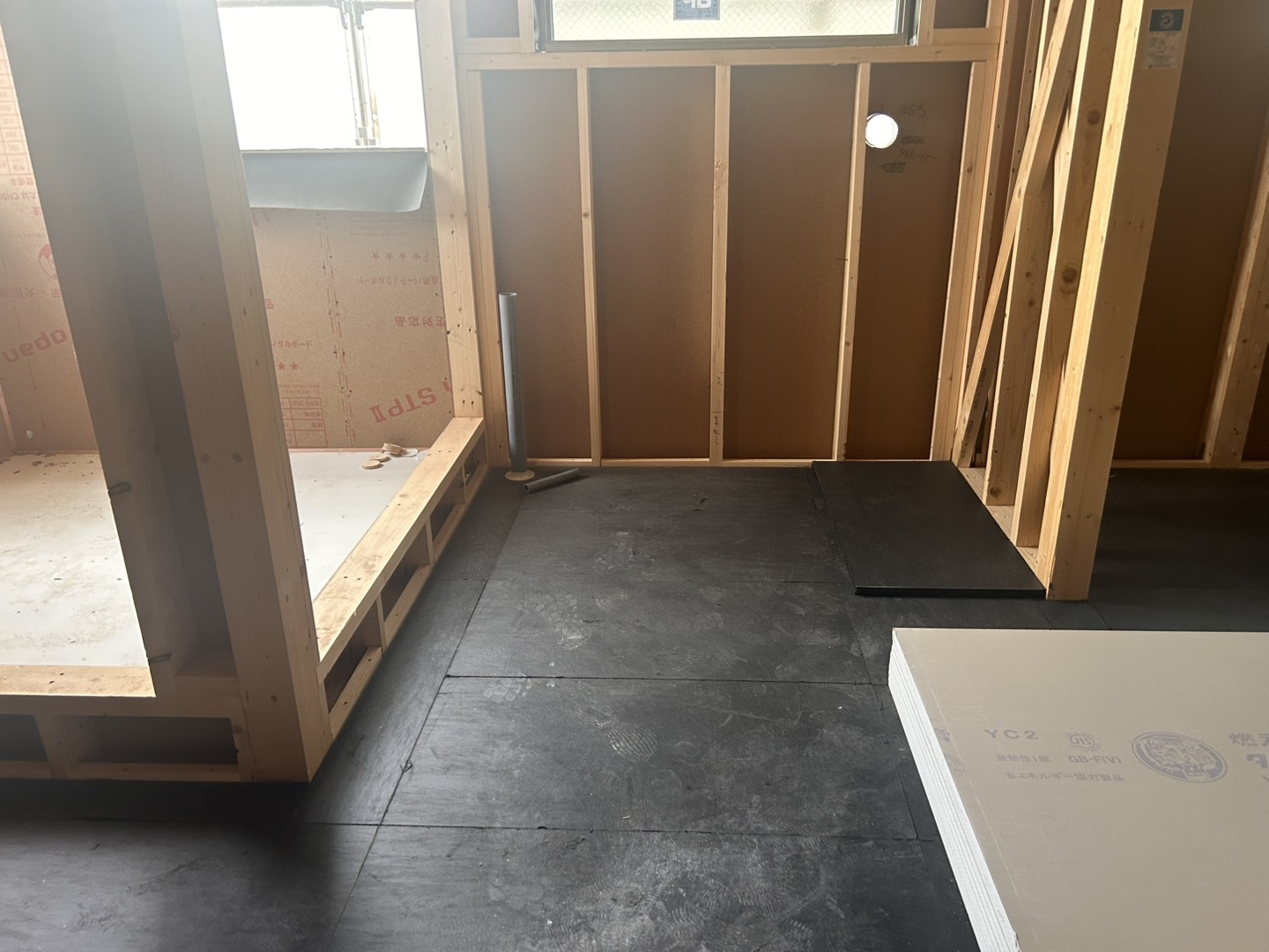 木造での建築にあたり、オーナー様が特に懸念されていたのが生活音への配慮でした。 そこで本計画では、一般的な木造住宅よりも遮音性能を高めた床・天井構成を採用しています。 床は構造用合板の上に遮音材、ゴム、フローリングを重ねた多層構造としました。通常よりも床厚を確保することで、上下階の音の伝わりを抑えています。 また、天井材を二重に貼ることで上階の生活音が伝わりにくい構成としました。 木造でありながら、共同住宅としての快適性を確保するため、構造段階から遮音性を重視した計画としています。