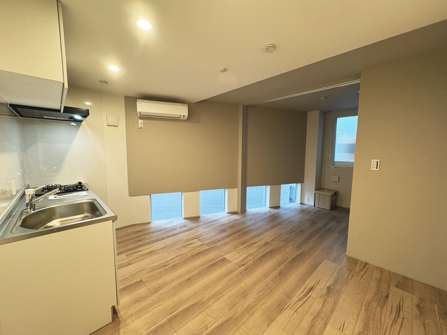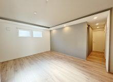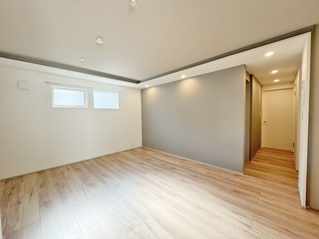 遮音性能を重視した床構成により、各階で床厚が増し、特に最上階である3階では、高さ制限により制約が生じました。構造的に梁が大きく現れてしまうため、そこで3階住戸では、梁の下面にあえて一枚板を張り、天井の一部として設計。 その中にスポットライトを組み込むことで、梁の存在を現しつつも、圧迫感を生み出すことなく、空間のデザイン要素として取り込んでいます。性能確保によって生じた制約を、そのまま弱点とせず、意匠へと転換しました。
