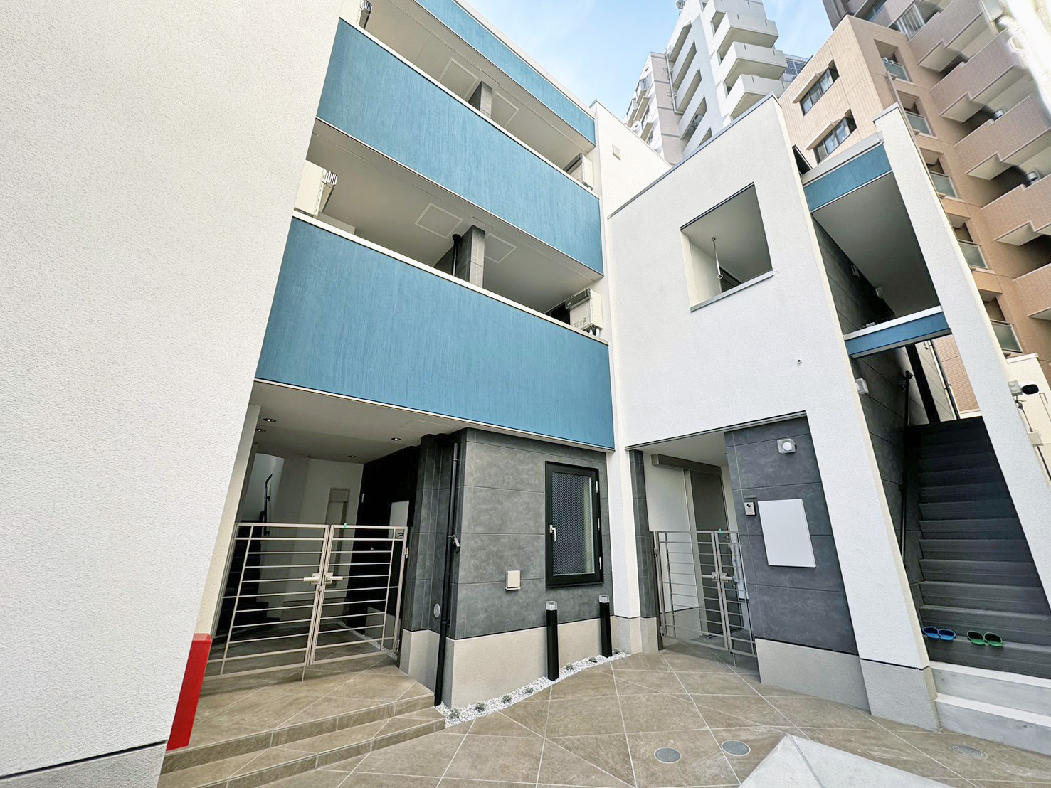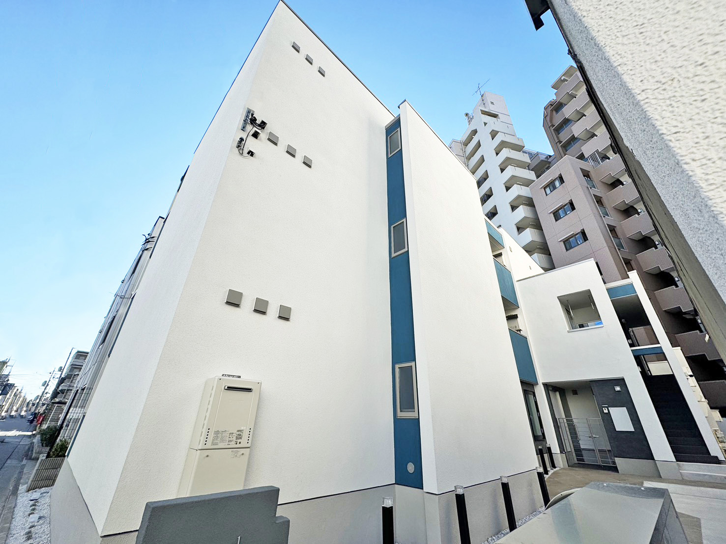 ファサードは、白い外壁をベースに、青を差し色として取り入れた構成としました。シンプルなボリュームの中に色彩でリズムを与え、街並みに埋もれない印象をつくっています。 また、排気フードなど外壁に露出する要素は、位置や高さを揃えて配置。細部まで整理することで、全体としてすっきりとした外観となるよう意識しました。