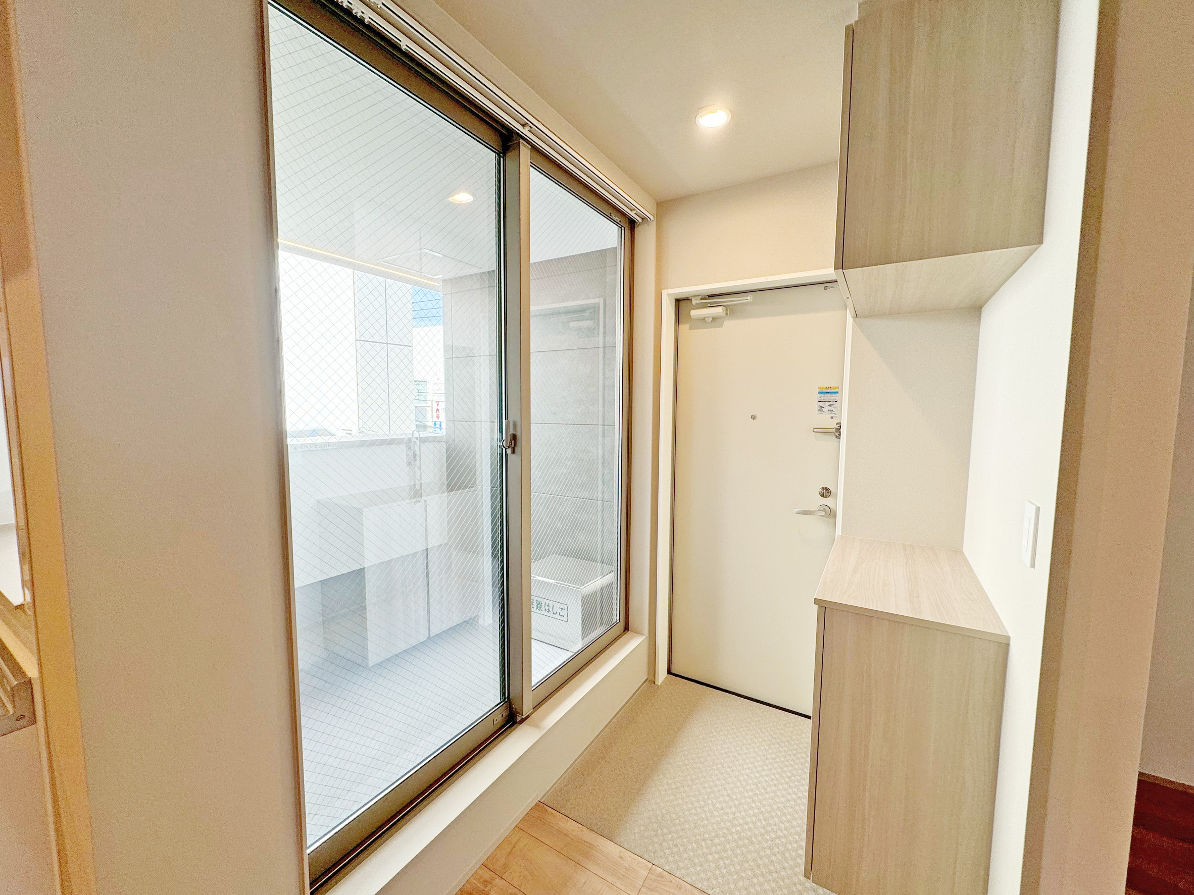 1階住戸では、周囲をマンションに囲まれた立地条件から、採光の確保が課題となっていました。 そこで屋外使用が可能な、白いパネルを外構に導入。パネル面で太陽光を反射させることで、室内へできるだけ光を取り込む計画としました。直接光が入りにくい条件の中でも、明るさを確保するための工夫です。